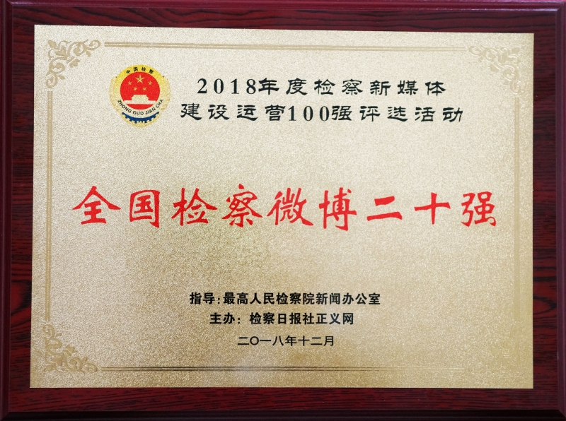 2018年度全国检察新媒体建设运营100强评选活动由最高人民检察院新闻办指导,检察日报社正义网主办,综合检察新媒体影响力、活跃度、吸引力、认可度、传播力等五个方面指标,分为初评、复评和定评三个阶段,通过数据统计、网络投票和专家评审等三轮筛选,从全国检察机关优秀的微博、微信、头条号、新媒体作品、检察官个人自媒体等五个类别新媒体中各评选出“全国20强”,最终产生全国检察新媒体100强。