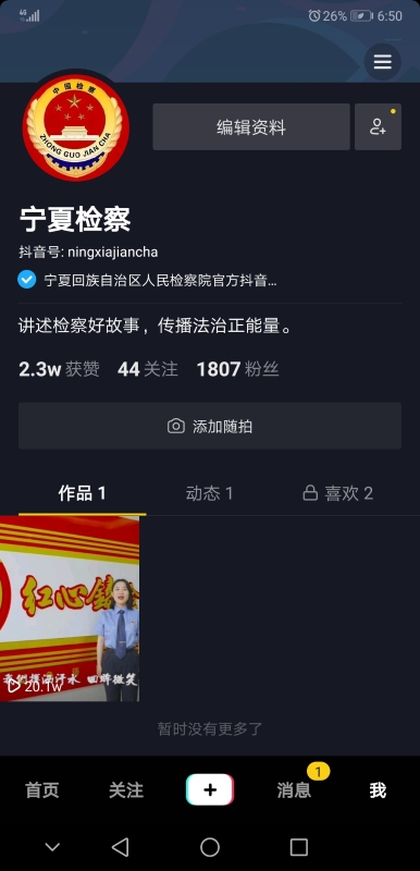 《我们都是追梦人》检察题材短视频一经发布即吸引了大量网友关注,短短一天时间,该条短视频阅读量超过了20万人次,获得点赞2.3万,吸引粉丝1800多人关注订阅。“抖音”作为当前热门流行的创意短视频新兴媒体平台,受众面广、传播力强、影响力大,拥有日活跃用户超3.2亿的巨大流量,成为各级政府部门和新闻媒体单位争相抢占的网络舆论新阵地。宁夏检察抖音号将通过发布生动活泼的检察题材短视频,全面展示新时代检察风采,并与宁夏检察微博、微信、新闻客户端、门户网站等网络宣传平台形成优势互补,着力打造“两微一端一网”+“一抖”的多形态、立体化、多层级新媒体传播矩阵。
