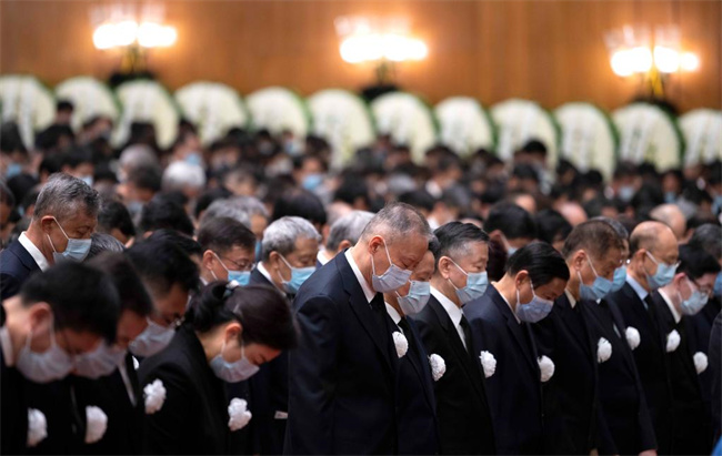习近平总书记致悼词期间,现场约5000名与会人员站立聆听。致悼词后,全场向江泽民同志深深三鞠躬。雄壮的《国际歌》响起,人们决心化悲痛为力量,以更加昂扬的斗志奋进新征程,以实际行动告慰江泽民同志。