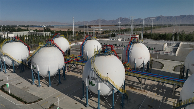 这是2023年6月30日拍摄的中国石化新疆库车绿氢示范项目制氢厂储氢罐区(无人机照片)。新华社记者 顾煜 摄