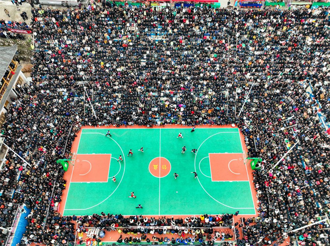 这是2023年3月27日在黔东南州台江县台盘村拍摄的贵州省首届“美丽乡村”篮球联赛总决赛比赛现场(无人机照片)。新华社记者 欧东衢 摄