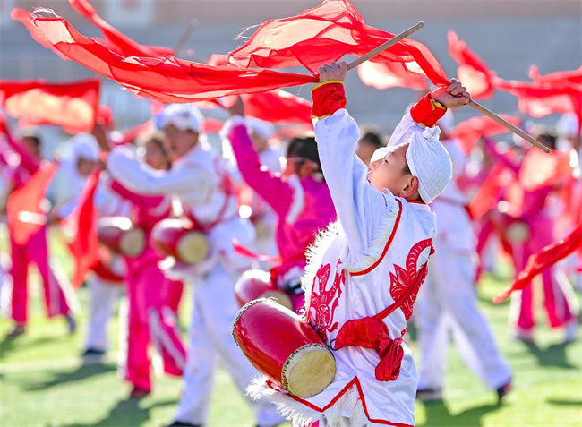 2023年11月16日,内蒙古鄂尔多斯市鄂托克前旗第二小学的学生在大课间表演安塞腰鼓。该校将安塞腰鼓列入学校的校本课程和大课间活动,聘请民间艺人传授技艺,让非遗文化在校园中传承。