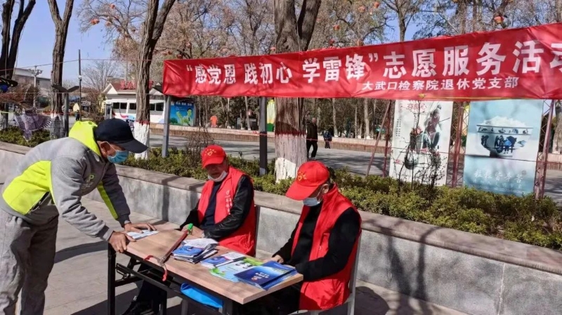 为继续发挥退休党员的检察职业精神,以实际行动践行热爱人民的革命情怀,传承伟大的建党精神和学雷锋精神。近日,大武口区人民检察院离退休党支部委员会开展“感恩党 践初心 学雷锋”志愿服务活动。