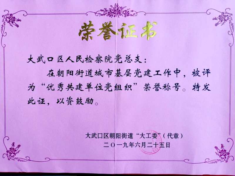 2019年6月25日,我院党总支被大武口区朝阳街道“大工委”评为优秀共建单位党组织。