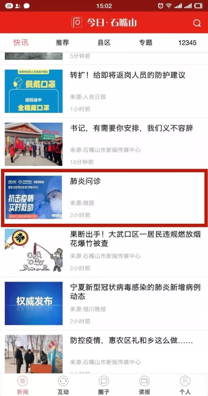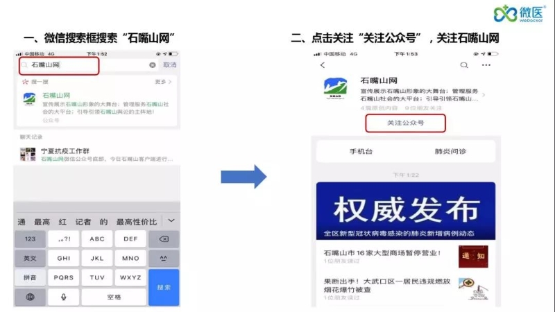 微医互联网总医院远程诊疗平台借助全国专家(目前线上已有12000多名医生专家),联合本地的医生专家(建议本地医生专家更多的加入互联网医院平台)给老百姓提供一个在线咨询的平台,逐步消除市民恐慌情绪,尤其是慢性病患者复诊以及常见病的诊疗再不用去医院,降低交叉感染风险。 1. 微医互联网总医院远程诊疗平台免费嵌入石嘴山网微信公众号,市民线上问诊使用方法如下: (1)在应用商店里搜索今日石嘴山客户端APP进行下载。 (2)点击“肺炎问诊”进入微医互联网总医院远程诊疗平台。