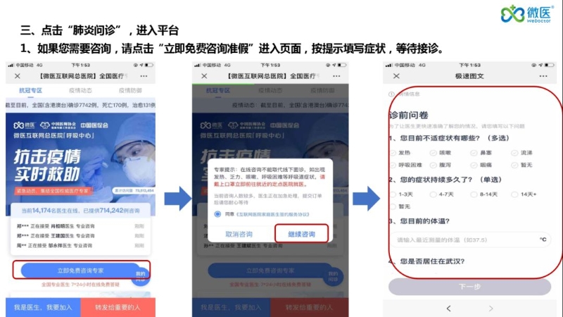 2.微医互联网总医院远程诊疗平台免费嵌入今日石嘴山客户端,市民线上问诊使用方法如下: