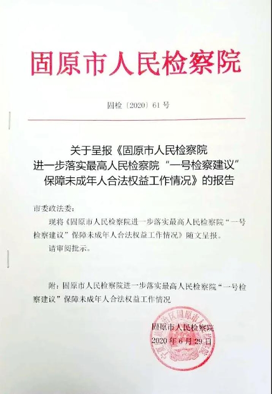 7月6日,固原市委常委、政法委书记吴会军在市检察院呈报的《固原市人民检察院进一步落实最高人民检察院“一号检察建议”保障未成年人合法权益工作情况》的报告(固检〔2020〕61号)上批示:很好!切实保障未成年人的合法权益是一件大事。市县(区)检察机关认真落实“一号检察建议”,通过扎实有效工作,取得了明显成效,探索出了许多好的做法。请再接再厉,务必推进。市委政法委编发简报,上报下发。