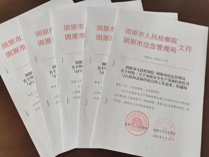 为深入贯彻落实最高人民检察院“八号检察建议”,加强安全生产领域检察职能与行政执法职能的协作配合,以法治方式推进安全生产治理体系和治理能力现代化建设,保障人民群众生命和财产安全。8月31日,固原市人民检察院联合市应急管理局制定出台《关于加强安全生产领域检察监督与行政执法协作配合的工作意见》(以下简称《工作意见》)。