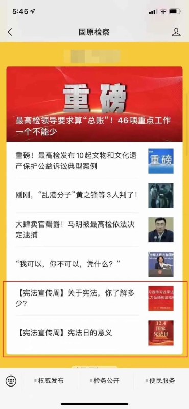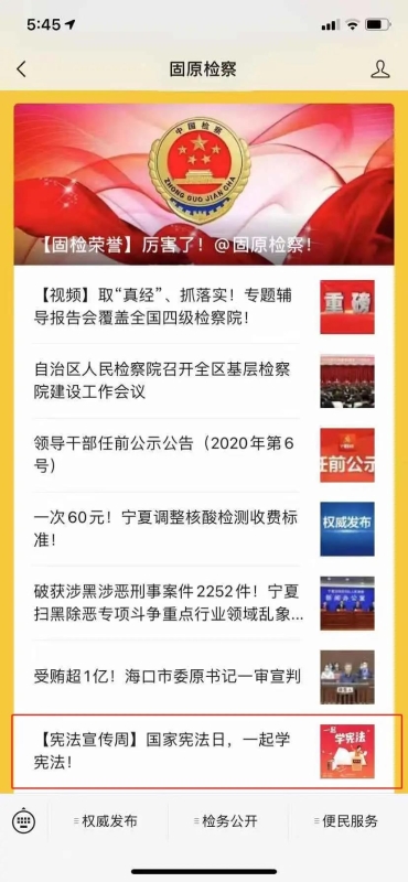 为深入学习贯彻习近平法治思想,弘扬宪法精神,加强新时代法律监督工作,在第七个“国家宪法日”和第三个“宪法宣传周”来临之际,固原市人民检察院举行“学习习近平法治思想,强化新时代法律监督”检察开放日活动。连日来,该院先后通过开展宪法法律进机关、进网络、进企业、进校园等活动形式,让更多各行各业广大人民群众进一步了解和参与检察工作,学习领悟习近平法治思想,感知法治的力量和真谛。