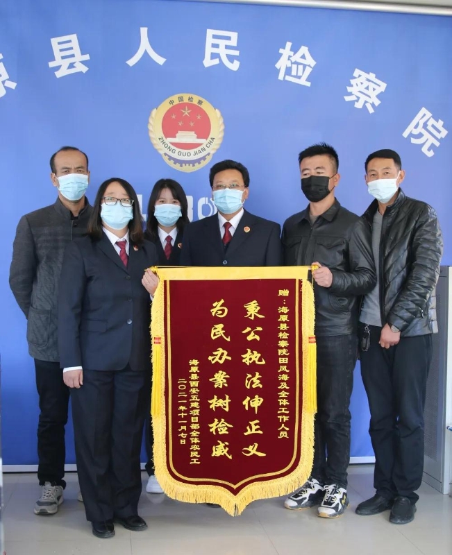 今年以来,海原县人民检察院学史力行,依托检察职能,聚焦民生民利,把体现人民利益,增进人民福祉贯穿司法办案全过程,将检察为民办实事做实。探索建立“五大机制”,横向联动人社、法院、公安、司法、信访等职能单位,着力破解农民工“讨薪难”。图为经过启动根治欠薪机制为两个劳务公司化解劳务工资136万元,使90余名农民工兄弟在年末顺利拿到“血汗钱”,方某等农民工为表示对检察机关的谢意而赠送的锦旗,此为海原县人民检察院自设立“根治欠薪工作站”以来收到的第三面锦旗。协作机制建立以来海原县人民检察院以人民利益至上的理念体现检察担当中的人民情怀,甘愿做农民工的“护薪人”,通过积极努力共为200余名农民工协调化解薪酬306万元。