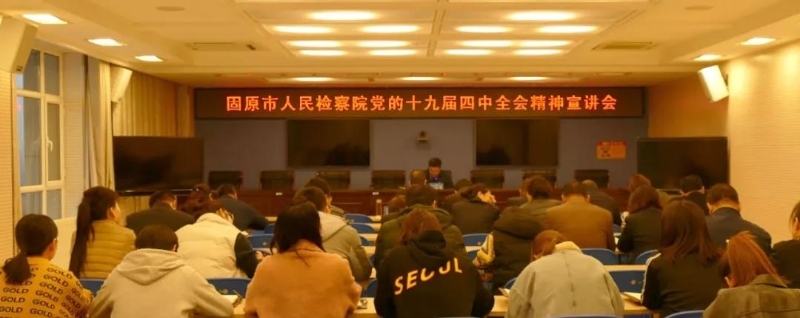 为把学习贯彻落实党的十九届四中全会精神引向深入,11月29日,固原市人民检察院召开党的十九届四中全会精神宣讲会,党组成员、政治部主任王东强对全会精神进行了宣讲。在单位的院领导和全院干警参加了宣讲会。