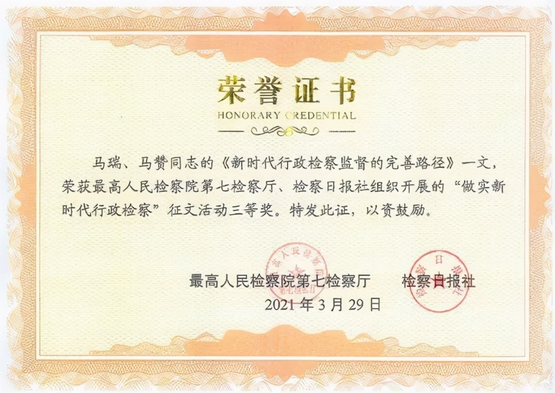 近日,在最高人民检察院第七检察厅和检察日报社联合开展的“做实新时代行政检察”征文活动中,灵武市人民检察院干警马瑞、马赞撰写的《新时代行政检察监督的完善路径》荣获三等奖,这也是此次征文活动中宁夏检察机关唯一获奖的论文。
