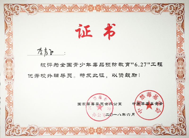 近日,国家禁毒办印发了《关于对全国青少年毒品预防教育“6.27”工程示范学校、优秀教师和优秀校外辅导员予以表扬的通报》的通知。平罗县人民检察院干警李彦飞荣获国家禁毒办“全国青少年毒品预防教育6.27工程优秀校外辅导员”荣誉称号。