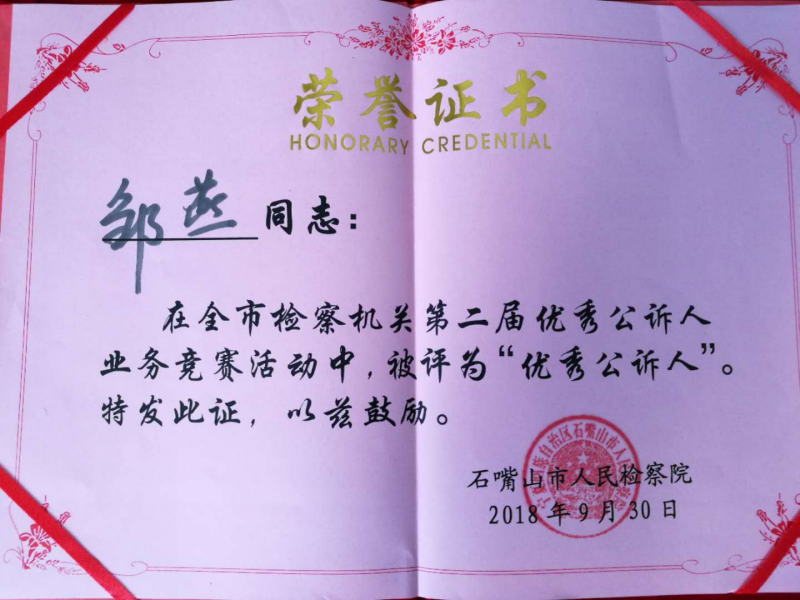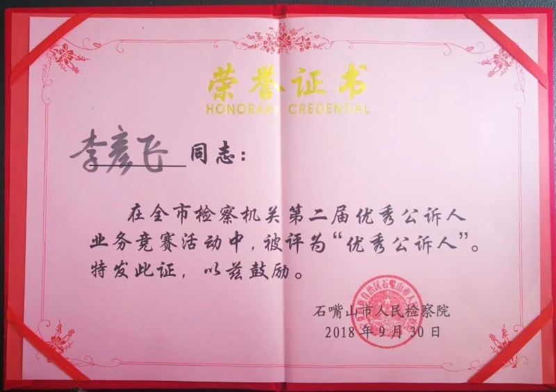 2018年9月28日至9月30日,石嘴山市检察机关优秀公诉人业务竞赛在石嘴山市人民检察院举行,经过三天紧张的决逐和激烈竞赛,我院干警邹燕、李彦飞荣获全市检察机关“优秀公诉人”荣誉称号。