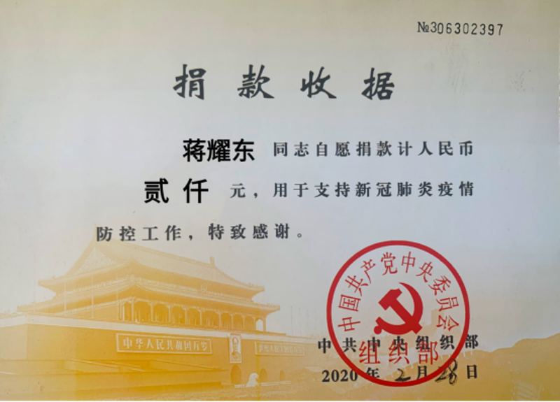 “我是代表父亲蒋耀东来捐款的,他临终前嘱托我,希望向党组织捐献2000元,为抗疫助绵薄之力。”蒋耀东之女蒋丽辉说。