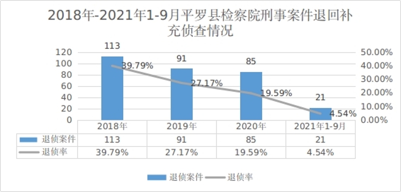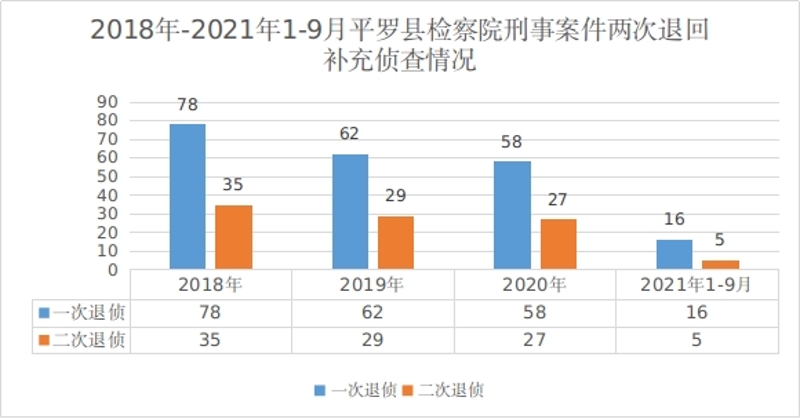 2018年1月至2021年9月,一次退回补充侦查共计214件,二次退回补充侦查96件,二次退回补充侦查占一次退回补充侦查率为44.86%。其中2018年 一次退回补充侦查78 件,二次退回补充侦查35 件,二次退回补充侦查占一次退回补充侦查率为44.87%;2019年 一次退回补充侦查62件,二次退回补充侦查29件,二次退回补充侦查占一次退回补充侦查率为46.77%;2020年一次退回补充侦查58件,二次退回补充侦27件,二次退回补充侦查占一次退回补充侦查率46.55%;2021年1-9月一次退回补充侦查16件,二次退回补充侦5件,二次退回补充侦查占一次退回补充侦查率31.25%。