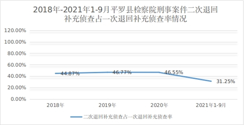 二次退回补充侦查占一次退回补充侦查率主要反映、评价一次退回补充侦查的质量和成效。目的是引导检察官在一次退回补充侦查的补侦提纲内详细说明补侦目的、方向、内容等,做好沟通解释工作,并加强对退补案件的引导侦查取证和跟踪监督,避免一退了之。2018年1月至2021年9月期间,平罗县检察院二次退回补充侦查占一次退回补充侦查率为44.86%,该比率数值仍较高,说明一次退回补充侦查的质量有待提高。