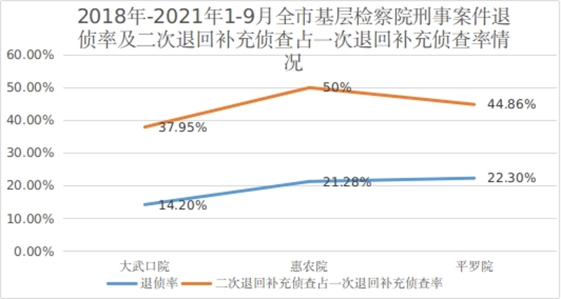 与全市其他基层检察院相比,大武口院退查率为14.20%,二次退回补充侦查占一次退回补充侦查率37.95%;惠农院退查率为21.28%,二次退回补充侦查占一次退回补充侦查率50%;平罗院退查率为22.3%,二次退回补充侦查占一次退回补充侦查率44.86%。