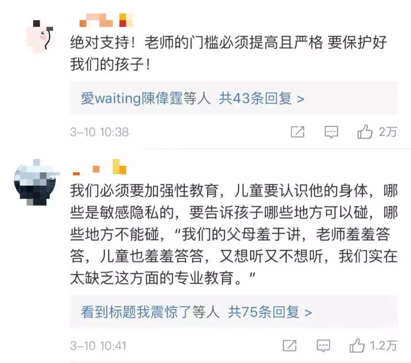 采访中,童建明提到:最高检建议加强预防性侵儿童和中小学生的工作,各级教育行政部门也上下联动,正在落实预防性侵害未成年人的教育保护制度,落实校园性侵强制报告、女童宿舍封闭管理等制度。