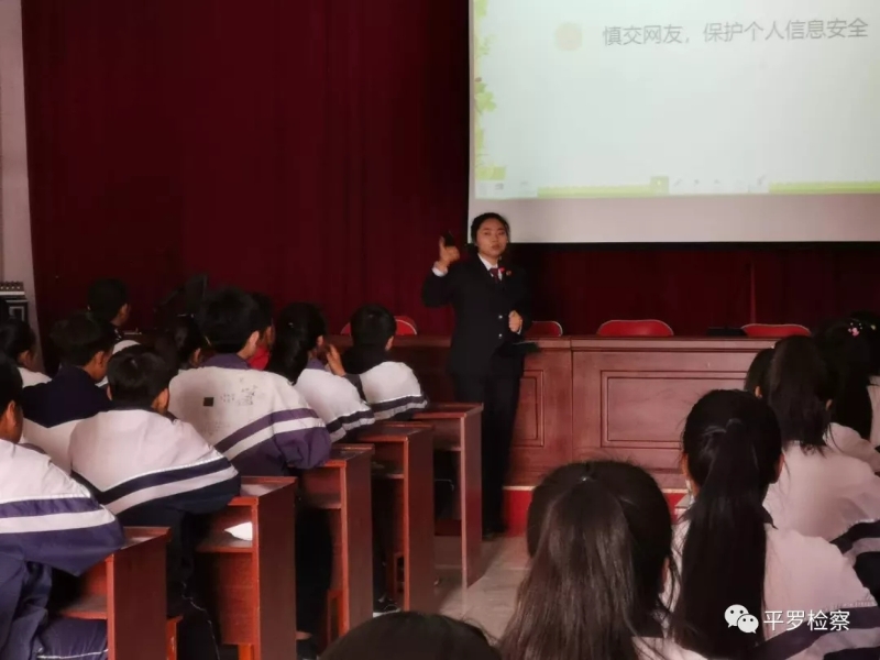 近日,平罗县人民检察院未成年人检察小组以“远离不良网络信息 保护个人信息安全”为主题分别在平罗县陶乐中学、黄渠桥中学、高庄乡中心学校开展法治宣讲教育活动,用生动的案例,形象的PPT,使学生们理解为何要远离不良网络信息和保护个人信息安全的重要性,提升了学生的自我防护意识和网络安全意识。