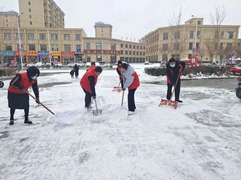 志愿者们不惧严寒,拿着雪铲、扫帚等工具踏雪而行,见雪即清,顾不上冰冻的手指和湿透的鞋袜,认真细致、全心全力清除着道路、广场、人行道、商铺门前的积雪和暗冰。虽然室外温度很低,但大家的热情却丝毫未减,一抹抹跃动的“志愿红”在白雪的映衬下显得分外温暖和耀眼。