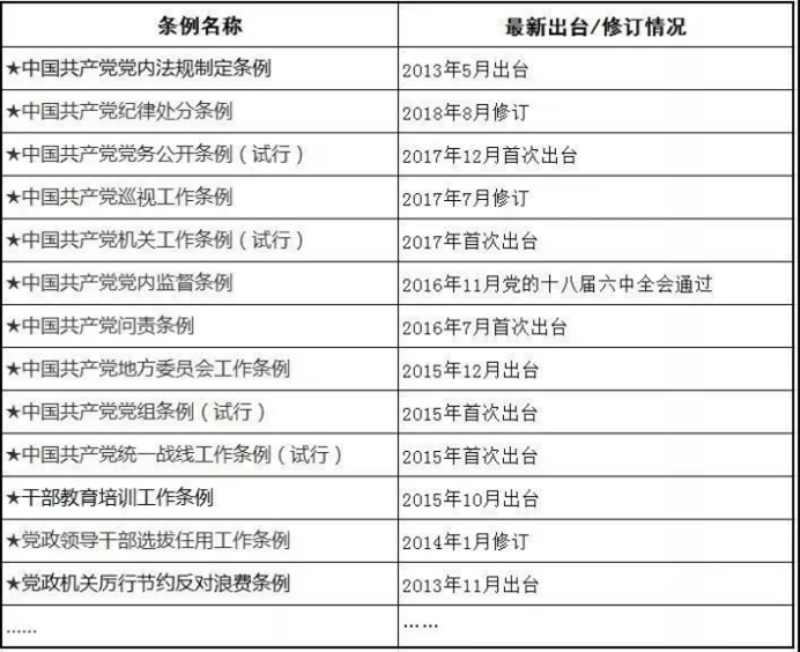 党的十八大以来,出台或修订的“条例”很多,如: