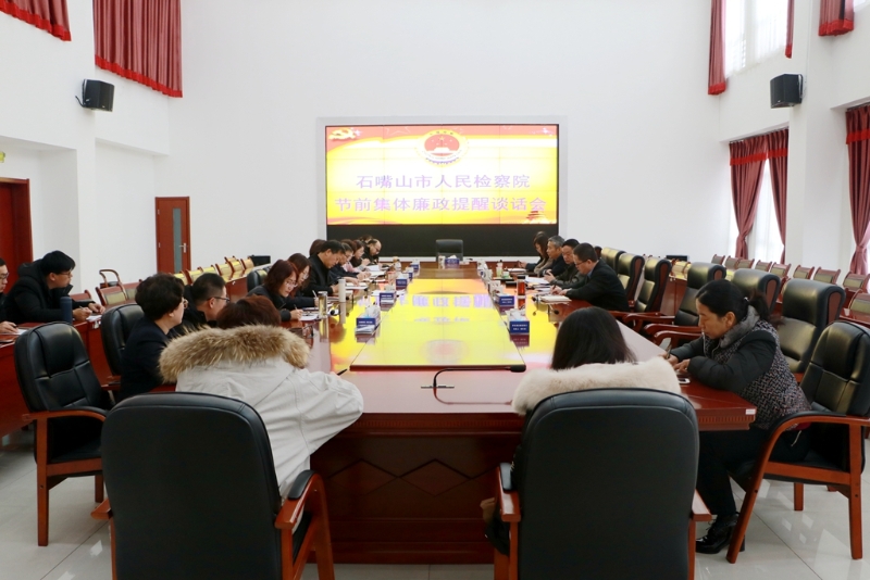 2020年春节将至,为进一步贯彻落实十九届四中全会精神、自治区党委十二届八次、九次全会和市委十届七次全会精神,持续巩固和拓展落实中央八项规定精神成果,驰而不息纠正“四风”特别是隐形变异“四风”问题,确保广大检察干警风清气正、廉洁祥和过节。1月15日,石嘴山市人民检察院召开春节前集体廉政提醒谈话会,院领导班子成员、中层领导干部参加了会议。