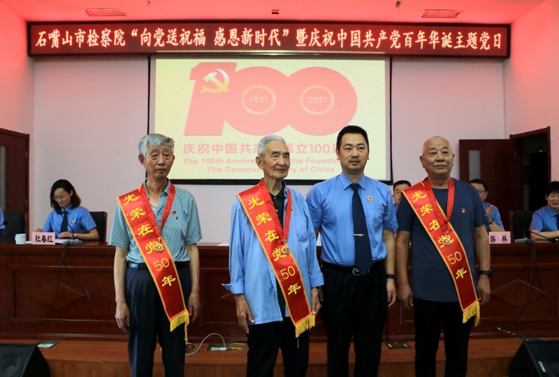活动在全体合唱国歌中拉开序幕,院党组成员、政治部主任杜春红宣读表彰决定。随后,表彰先进党支部、优秀共产党员、优秀党务工作者,支部书记为新发展党员佩戴徽章 。“光荣在党50年”纪念章颁发仪式上,市检察院党组书记、检察长曹湘宁为“光荣在党50年”老同志代表披绶带、颁发纪念章。