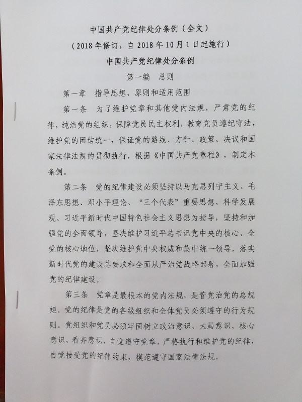 2018年10月1日起新修订施行的《条例》全面贯彻了党中央全面从严治党的要求,体现了习近平新时代中国特色社会主义思想对管党治党提出的新要求,突出了党的纪律处分更严、更具体、更明确、更规范的特点。为切实抓好新《条例》的贯彻落实,吴忠市人民检察院要求党员干部必须在“三个方面”下功夫,充分使铁的纪律真正转化为党员干部的日常习惯和自觉遵循,推动从严治党向纵深发展:一是在加强学习上下功夫。把学习贯彻习近平新时代中国特色社会主义思想和党的十九大精神作为长期的、常态的学习任务抓紧抓好,深入了解党中央的决策部署和方针政策,及时更新学习党内各项规章条例,从而更好地用新思想武装头脑,指导实践,推动工作。二是在个人思想锤炼上下功夫。党员干部要坚定理想信念,牢固树立党章党规意识,严守党的政治纪律和政治规矩,在重大原则问题上站稳政治立场、保持清醒头脑。三是在个人言行规范上下功夫。要深化对新《条例》的学习,做到熟知精通,自觉在廉洁自律上追求高标准,远离违纪红线,做守纪律、讲规矩的模范。