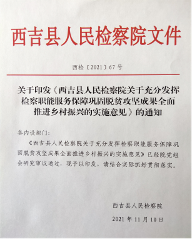 为深入贯彻《中共中央国务院关于全面推进乡村振兴加快农业农村现代化的意见》和区、市、县党委和政府关于全面推进乡村振兴加快农业农村现代化的有关文件精神,充分发挥检察职能,全力服务保障巩固脱贫攻坚成果全面推进乡村振兴,促进农业高质高效、乡村宜居宜业、农民富裕富足,近日,西吉县人民检察院制定印发了《西吉县人民检察院关于充分发挥检察职能服务保障巩固脱贫攻坚成果全面推进乡村振兴的实施意见》(以下简称《意见》)。