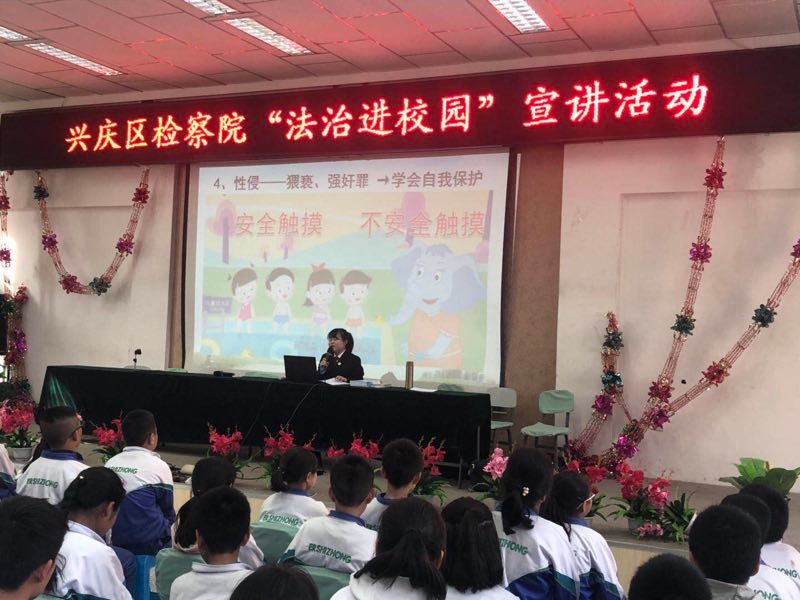 活动中,检察官借助PPT和动画短片的形式,让同学们了解了什么是检察工作,进而引入了未成年人比较常见的法律罪名,如故意伤害罪、盗窃罪、寻衅滋事罪等,通过有趣的话语和生动的图片让同学们了解到生活中处处有法律。结合“一号检察建议”的精神,检察官们通过做游戏的方式,与同学们进行互动,带领同学们了解了什么是“安全触摸与不安全触摸”,并通过典型案例向同学们讲述了“早恋”所带来的危害。同时从防拐防骗、抵制校园欺凌、预防性侵害、防范黑恶势力等方面提醒同学们及在场的老师家长注意提高防范意识。