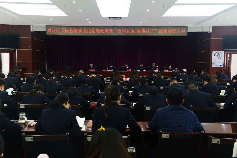 为深入贯彻落实政法队伍教育整顿工作部署,深刻领会“自查从宽,被查从严”政策精神,助推查纠整改工作见真章、出实效,4月17日上午,兴庆区人民检察院召开党纪党规教育暨“自查从宽,被查从严”政策解读大会。