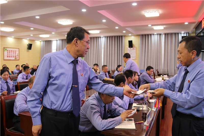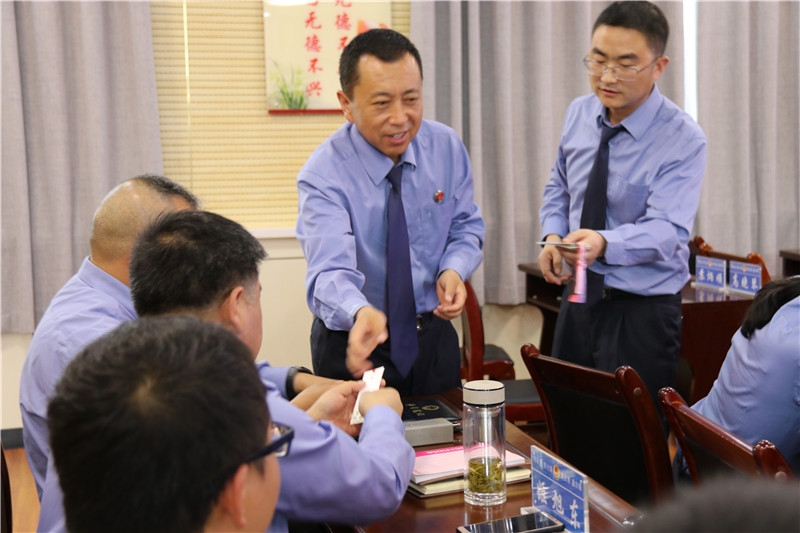 院领导向干警送上纪念品书签,寓意送祝福。希望全体干警无论贫穷,还是富有都不要舍弃“勤俭节约”这一传统美德。