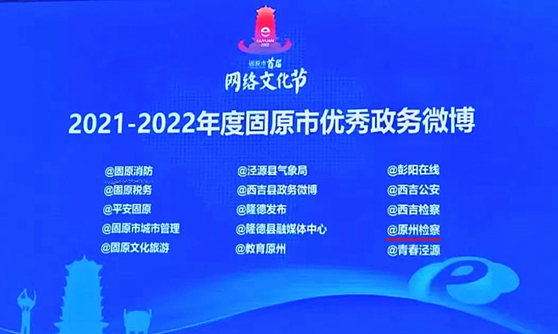 近日,在固原市首届网络文化节启动仪式上,固原市人民政府办公室、中共固原市委宣传部、中共固原市委网信办联合表彰了2021年度至2022年度优秀政务微博、微信、自媒体正能量案例、网络安全先进单位、先进个人及网络宣传先进工作者、固原好网民,原州区人民检察院被授予“优秀政务微博”荣誉称号。
