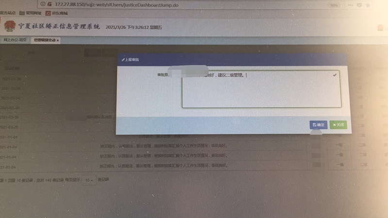 4月6日,在原州区司法局古雁司法所开展在矫未成年人考核奖惩监督活动。古雁司法所对一名因故意伤害罪被判处拘役,宣告缓刑的在矫未成年人,及时记录其认罪悔罪、接受监督管理、参加教育学习和社区服务等遵守有关规定情况,对该在矫未成年人在矫四个月以来接受矫正的表现进行考核并根据考核结果,由一级管理调整为二级管理。原州区检察院对该考核奖惩小组的组成、日常考核与定期考核内容、考核决定、分类管理情况等进行监督,督促司法机关进一步提高涉罪未成年人社区矫正管理水平。
