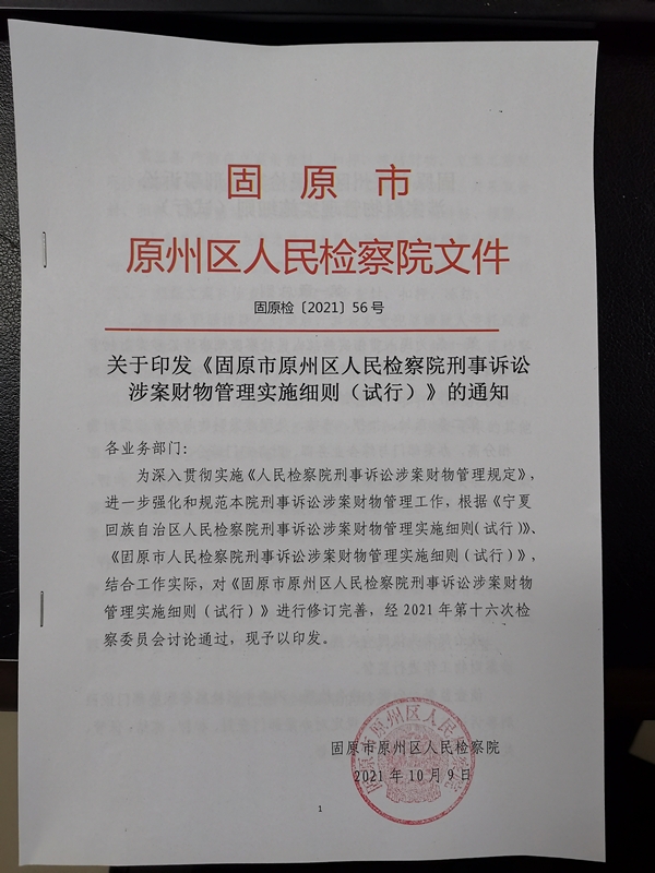 10月9日,原州区人民检察院检察委员会召开会议,对涉案款物管理工作进行了专题研究,通过了《固原市原州区人民检察院刑事诉讼涉案财物管理实施细则(试行)》(下文简称《细则》)。