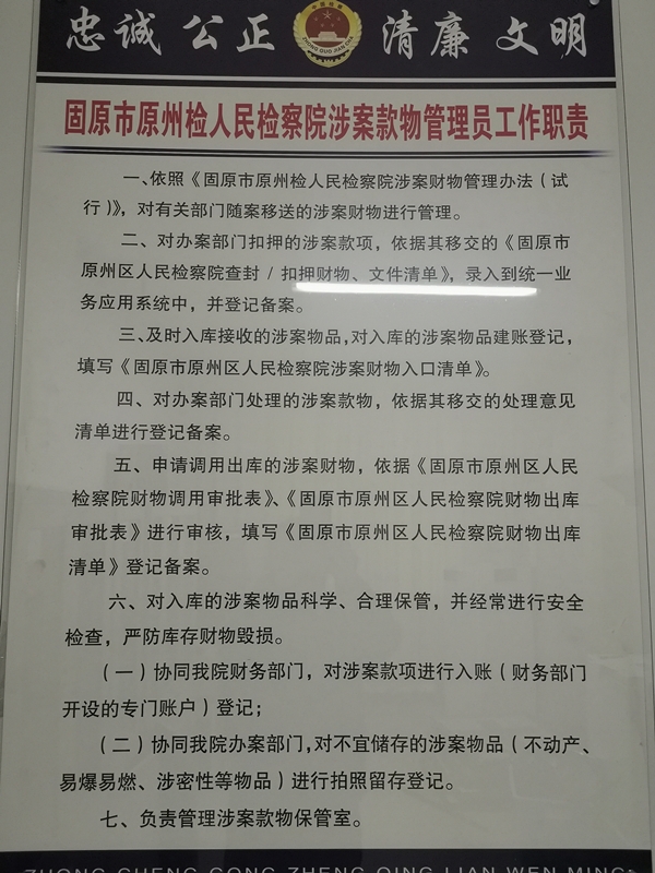 为进一步做好政法队伍教育整顿后半篇文章,原州区人民检察院针对涉案财物数量多、任务重的情况,坚持问题导向,以全区检察机关涉案财物专项清查工作为契机,多措并举,扎实组织开展了涉案财物专项清查工作。完善管理制度,细化工作措施,堵塞涉案财物管理工作中的漏洞,着力推进管理工作科学化、制度化。