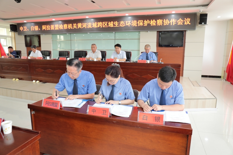 为深入贯彻落实习近平总书记视察宁夏重要讲话精神,加强黄河流域生态保护,7月24日,宁夏中卫市检察院、甘肃白银市检察院、内蒙古阿拉善盟检察分院在中卫市检察院召开了黄河流域跨区域生态环境保护检察协作会议。中卫市人民检察院党组书记、检察长赵红香,甘肃省白银市人民检察院党组书记、检察长王志坚,内蒙古自治区人民检察院阿拉善盟分院党组成员、副检察长陈卫东共同签署《关于建立黄河流域跨区域生态环境保护检察协作机制的意见》(以下简称《意见》),会议由中卫市检察院党组副书记、副检察长史天忠主持。中卫市人大常委会、市政协、市委政法委、市生态环境局领导同志应邀参加会议。
