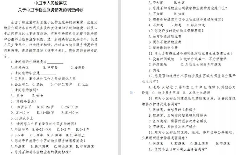 市检察院精心制作了《关于中卫市物业服务情况的调查问卷》,通过实地走访、张贴海报的方式宣传鼓励群众积极参与问卷调查,共有1200余人参与答卷。调查结果显示,中卫市近69%的答卷人明确表示对目前居住小区的物业服务不满意,70.98%的答卷人反映对小区道路、绿地、停车位等公共用地、公共场所经营管理不满意,80.45%的答卷人反映不知道物业费的用途,92.05%的答卷人反映业主不按时缴纳物业费的主要原因是对物业服务企业的服务不满意……上述结果为检察机关了解中卫市物业服务领域存在的问题并依法监督提供了充分、客观的事实基础。