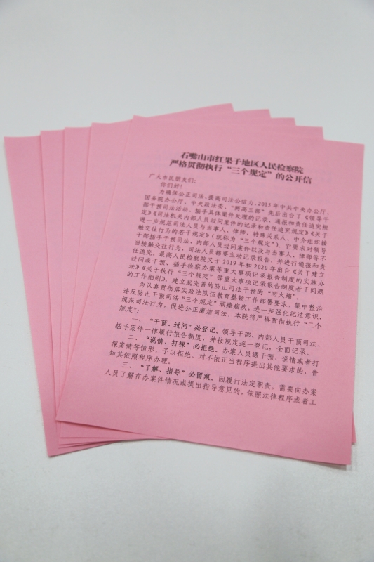 在开展“三个规定”顽瘴痼疾工作中,该院还制作了《三个规定”告知书》和《严格贯彻执行“三个规定”公开信》通过制发“三个现定”告知书,要求检察官在办案时程中向案件当事人、律师宣传“三个规定”有关要求,让当事人、律师不要违规接触检察人员,对发现的违规过问、干预、插手检察办案行为要积极反映检举。制发的《公开信》通过在公告栏张贴,向石嘴山监狱、石嘴山看守所民警发放的形式,广泛宣传“三个规定”,有效提升全社会对“三个规定”的知晓度和参与度,共同营造风清气正的司法环境。
