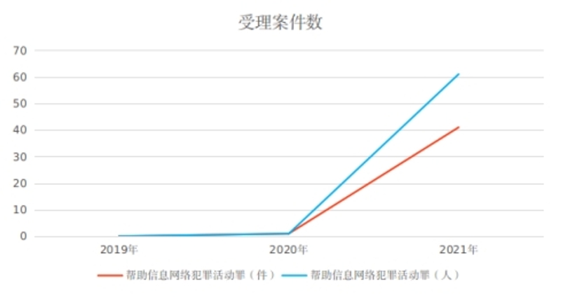(一)案件数量呈现递增趋势。2019年至2021年,我院共受理帮助信息网络犯罪活动罪案件42件62人,其中2019年受理0件0人;2020年受理1件1人;2021年受理41件61人。