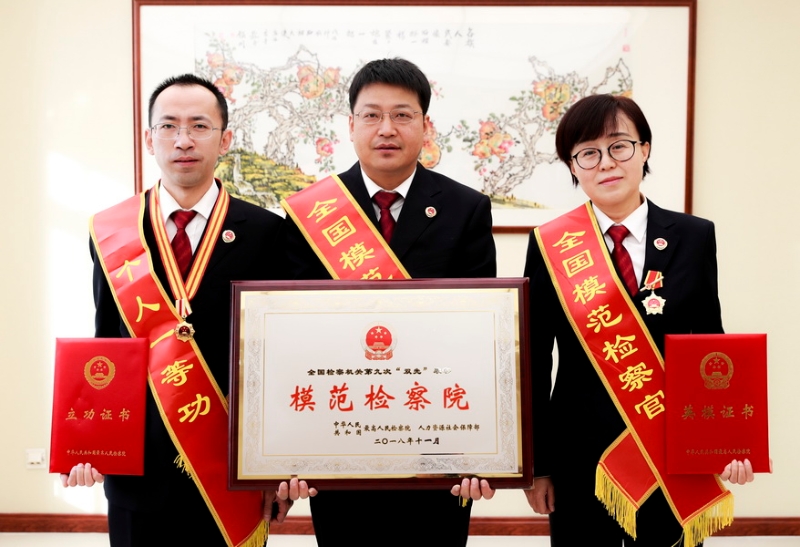灵武市人民检察院党组书记、检察长马俊峰(中)、吴忠市人民检察院驻看守检察室主任张艳华(右)、银川市人民检察院公诉处处长魏宏宇 全国模范检察院 灵武市人民检察院党组书记、检察长 马俊峰 灵武市人民检察院荣膺“全国模范检察院”称号,是上级检察院精心培养、正确领导和指导的结果,也是全体干警精诚团结、奋力拼搏的结果,我们深受鼓舞、倍感振奋。灵武市人民检察院在党委和上级检察机关的领导下,先后获得“全国文明单位”“全国科技强检示范院”“全国检察机关保障律师执业权利示范单位”等诸多殊荣,取得的成绩令我们自豪但决不自满,也决不躺在过去的功劳簿上沾沾自喜。我们深深感到,荣誉是一份责任,也是一种鞭策,不仅要加倍珍惜,更要始终保持忧患意识和不仅则退的紧迫感,不断夯实基础和内功,在新起点踏上新征程,把今天的荣誉作为今后不断发展进步的强大动力,再创佳绩,再立新功。 全国模范检察官 吴忠市人民检察院驻看守所检察室主任 张艳华 首先感谢自治区检察院党组和各位领导及高检院对我的关心和培养,我们驻所检察室近几年获得的多项荣誉,都离不开吴忠市院党组和各级领导给予的关心和支持。今后,我将做好检察官榜样,传承模范精神,加强学习知识,努力提升自我,严格要求队伍,带头履职尽责。我将以此荣誉为起点,一如既往地深耕检察监督主业,深研细判法律法规的正确适用,严格恪守检察官职业道德、全身心守望公平与正义,不断完善自己、超越自己。切实履行法律监督职责,为法治宁夏作出自己应有的贡献。 全国检察机关个人一等功 银川市人民检察院公诉处处长 魏宏宇 昨天我参加了在北京召开的“双先”表彰大会,接受最高人民检察院为我记功,倍感荣幸和自豪,在此我要感谢自治区院和银川市院多年的培养,感谢各位领导的亲切关怀和同事们的大力支持。 作为一名普通的党员检察人员,我将以习近平新时代中国特色社会主义思想为指引,认真贯彻高检院“讲政治、顾大局、谋发展、重自强”的新要求,增强“四个意识”,坚定“四个自信”,自觉投身司法体制改革大局,增强自身政治素养和业务能力,恪守法律监督宪法职责,牢固树立证据裁判意识,在公诉岗位上自觉践行“建设美丽新宁夏 共圆伟大中国梦”的伟大号召,努力让人民群众在每一个司法案件中感受到公平正义。