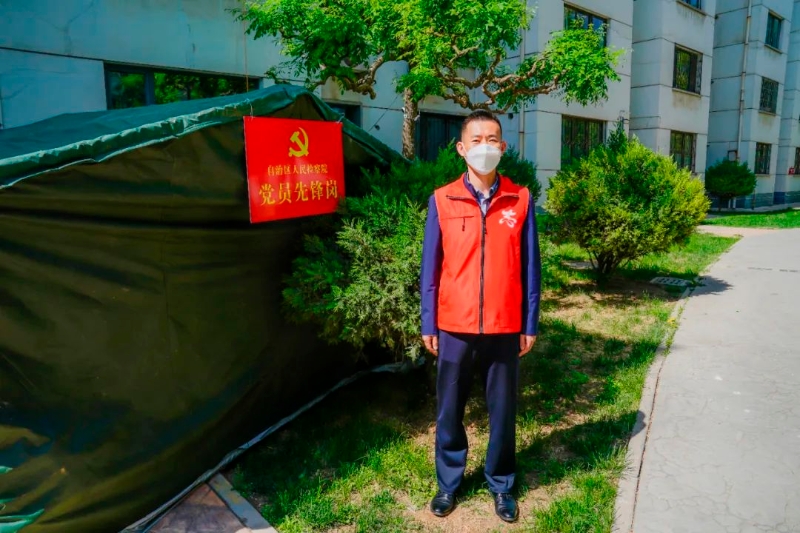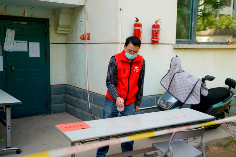 5月5日上午,自治区人民检察院干警朱继斌在银川市大地世纪小区临时封控单元楼下认真开展环境消杀。连日来,面对银川“4.24”突发疫情,自治区人民检察院20名检察干警主动放弃“五一”假期休息,下沉社区参与疫情防控志愿工作。